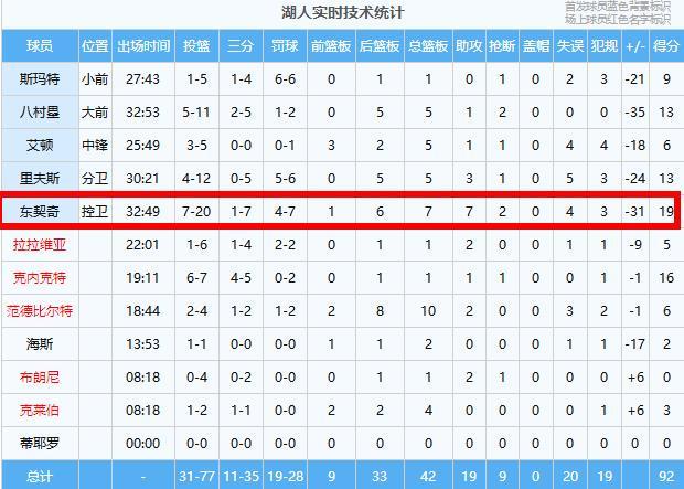 湖人:东契奇19分7板7助2断、克内克特16分1板1助、里夫斯13分5板3助、八村塁13分5板1助2断、斯玛特9分1板、范德比尔特6分10板2助、艾顿6分5板1助、拉拉维亚5分1板2助