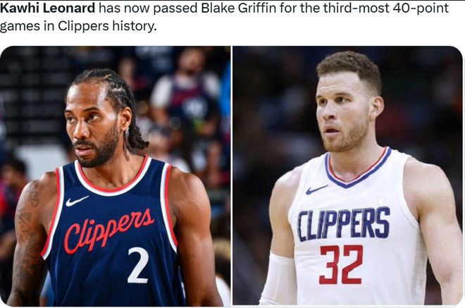 第六,在快船对视中,莱昂纳德的单场40分场次已经超过了布雷克-格里芬(快船职业生涯3次单场40分)。