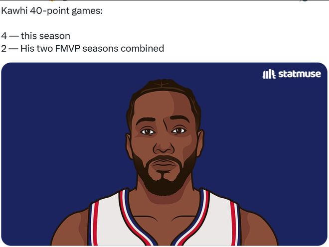 首先,这是莱昂纳德本赛季第四次单场40+分,对于他来说在职业生涯的单赛季中这是最多的。