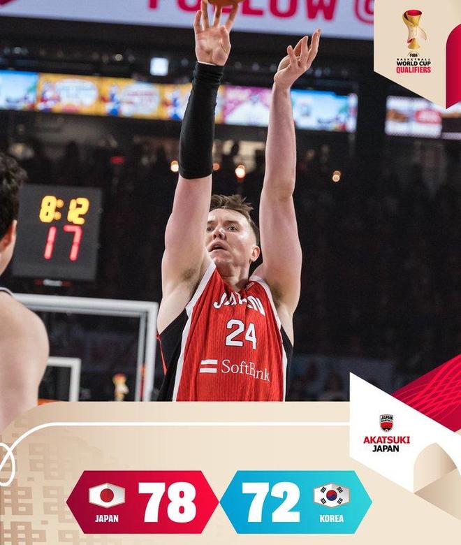 此次日韩对决,堪称B组的“头名之争”,两队赛前的战绩相同,这场比赛的结果直接决定了小组头名的归属,同时也间接影响着后续各队的排名走向。值得注意的是,日本男篮在本场比赛中做出了关键的阵容调整,用归化中锋约书亚·霍金森替换了上一场对阵中国男篮时表现低迷的另一位归化球员亚历克斯·柯克,这一调整最终成为了比赛的转折点。霍金森作为日本男篮的核心归化球员,曾在2023年世界杯上交出场均21.0分、10.8篮板的恐怖数据,是日本男篮直通巴黎奥运会的关键功臣,而柯克则因移动速度慢、灵活性不足的短板,在上一场对阵中国男篮时未能发挥有效作用,中国男篮也得以在那场比赛中以87-80逆转取胜,收获本届世预赛首胜。