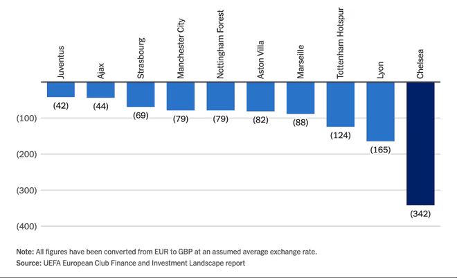 切尔西以4.07亿欧元的巨额赤字“遥遥领先”,其亏损额甚至比排名第二的里昂(1.88亿欧元)多出了一倍有余。